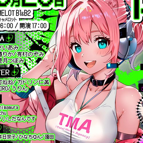 2025年10月25日(土)に「アニクラTMA14~今年はキラキラを見たいから渋谷にイカネヴァ!~」が開催される。かさいあみ、椿りか、有村のぞみといったセクシー女優をはじめ、「TEAMTMA」として、無無田、小町